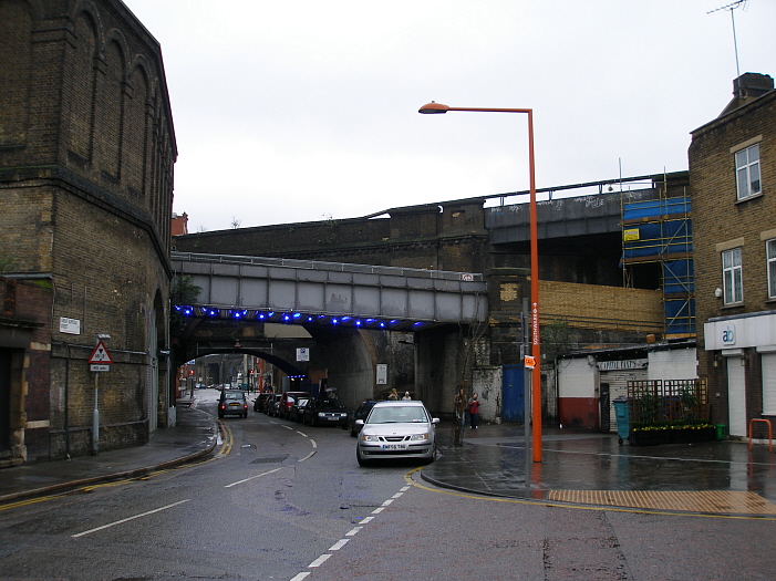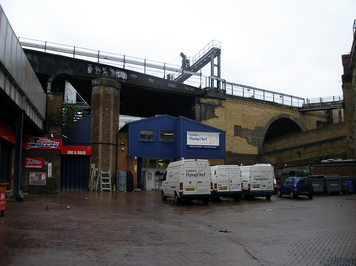 A westward view shows the depot entrance road, seen in the previous picture, plunging into the tunnel on the right. The wall on the extreme right is the ascending Blackfriars spur from London Bridge, the steel bridge on the far left is the London Bridge to Charing Cross line and, finally, the bridge dominating the background is that which carries the line from Herne Hill and Elephant & Castle. © David Glasspool