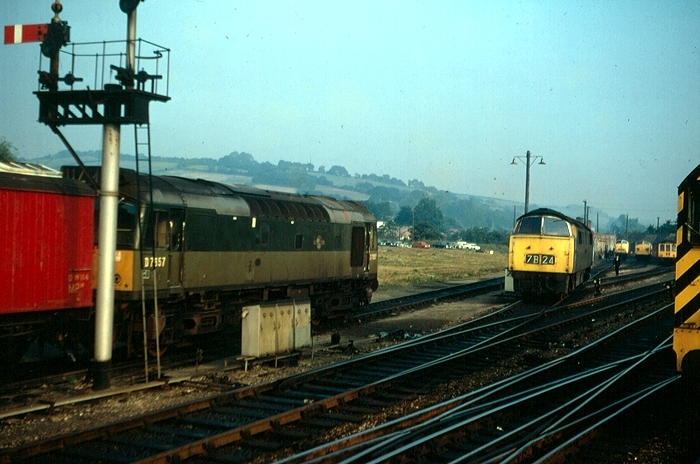 We now briefly go back further in time to 1970, where we see D7657 (later Class 25 No. 25307) parked in front of the engineers' train. This train, painted red, was for long a resident of Exeter St David's, and was stabled near the former atmospheric pump house. It has already been seen in two other photographs within this section so far. A ''Western'' diesel hydraulic (later Class 52) is seen to the right, whilst in the background can be seen D800 ''Warship'' and D6300 series diesels. The two tracks in the foreground were the freight avoiding lines, then still operational. © David Glasspool Collection