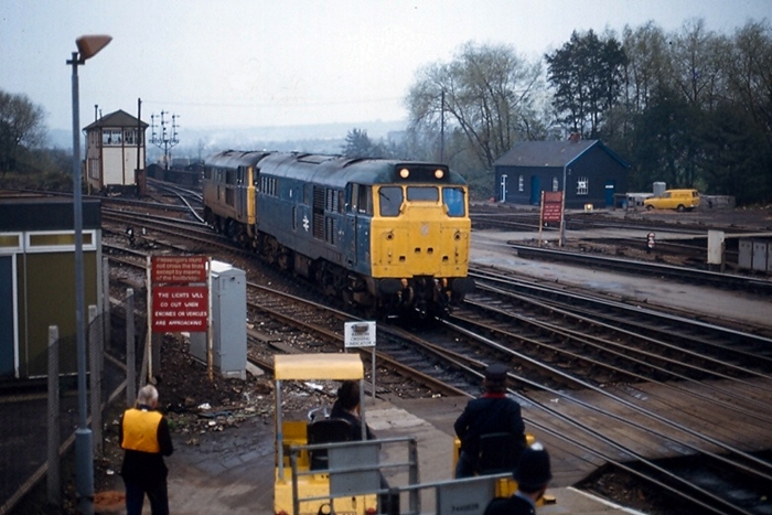 More Class 31 action is seen here, with diesel Nos. 31158 and 31174 running round a fifteen coach train. This was in fact a charter service, and became the last train to run over the Torrington branch, carrying the head board ''The Last Atlantic Coast Express''. The rail tour had originated from Bristol Temple Meads and required a reversal at Exeter St David's to access the Barnstaple and Torrington branches. © David Glasspool Collection