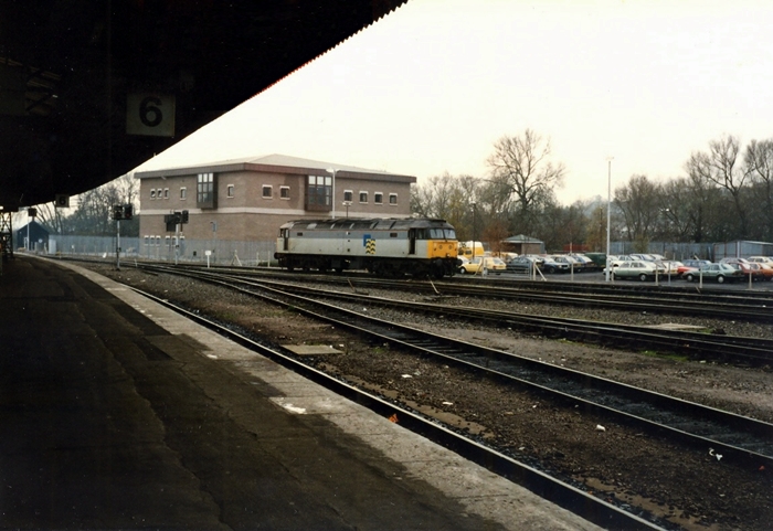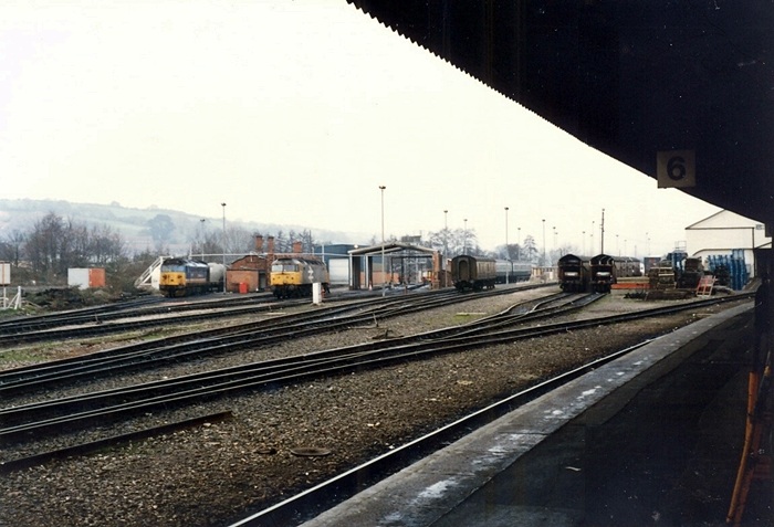 A roughly northward view shows the former engine shed site, which at this time had found a new use as a diesel depot. On the far left is Class 50 No. 50018 ''Resolution'', to the right Class 47 No. 47318 in all-over Railfreight Grey, a BR Mk 1 Full Brake and, finally, a pair of enclosed car carrying wagons. The points in the yard were still worked by manual levers. © Mike Glasspool