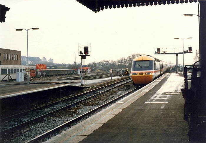An HST on a Penzance to Newcastle service arrives at platform 5, wearing the then new InterCity ''Swallow'' livery. On the left can once again be seen the spur from Exeter Central, which had lost its connection with platform 4's track as part of the 1985 re-signalling. © Mike Glasspool