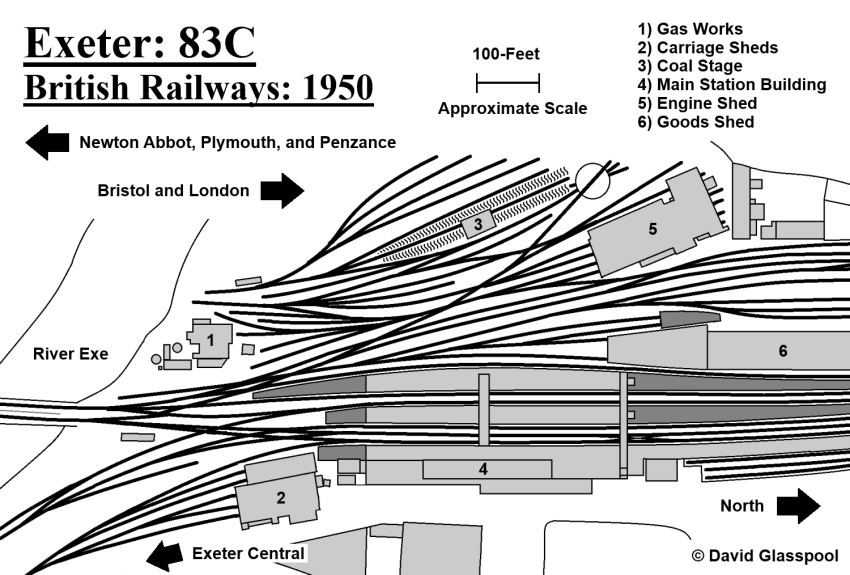 The B&ER shed referred to above was the predecessor of the depot that served steam right through until 1963, situated in-between the station and the River Exe. As for the SDR’s shed site, the "three-arch bridge" mentioned in the newspaper article is that which today still carries the connecting line between Exeter Central and St David's stations over Bonhay Road. This places the SDR’s locomotive facilities beside the LSWR’s curve, leading your author to suspect that the carriage sheds which occupied the site immediately south of St David's’ "down" platform, east of the junction with the spur to Central station, originally formed this company’s engine shed. Based on photographs, these structures were flattened in 1977.