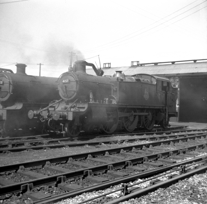 Large Prairie No. 4157 is seen on the eastern-most shed track, the building being evident behind. The shed had been re-roofed in asbestos by this time (previously, it was slate) and doors removed. In the 1955 Ian Allan ABC Locoshed book, current to 21st May of that year, No. 4157 was listed as being allocated to Bristol Bath Road (82A). The engine was withdrawn from Severn Tunnel Junction (86E) in June 1965 (ref: RCTS’ The Railway Observer, August 1965). © David Glasspool Collection