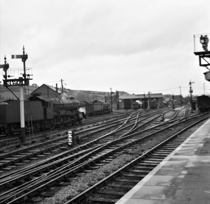 A northward view from the western-most island platform of Exeter St David’s has the engine shed roughly centre distance and, just visible above the 4-6-0 "County" Class on the left, is the elevated coal stage. At multiple GWR sheds, the coal stage also hosted a water tank, but since this was instead put atop the former pump house at Exeter, a shed with a slated pitched roof prevailed. The tracks to the right of the engine shed formed a freight loop that bypassed the station and passed over Red Cow Crossing, the latter immediately north of the platforms. © David Glasspool Collection
