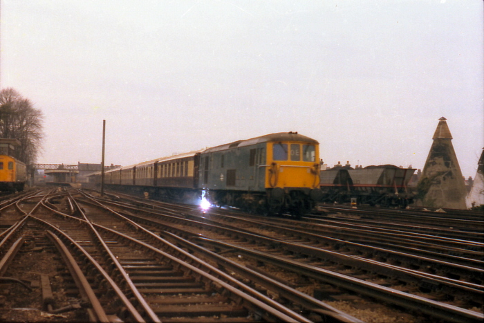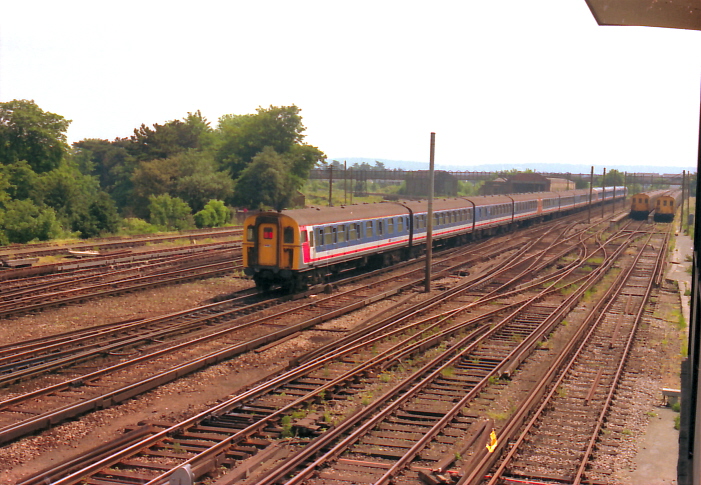 here is of much interest: in the stabling sidings on the right are BR-designed EPB units, whilst in the background