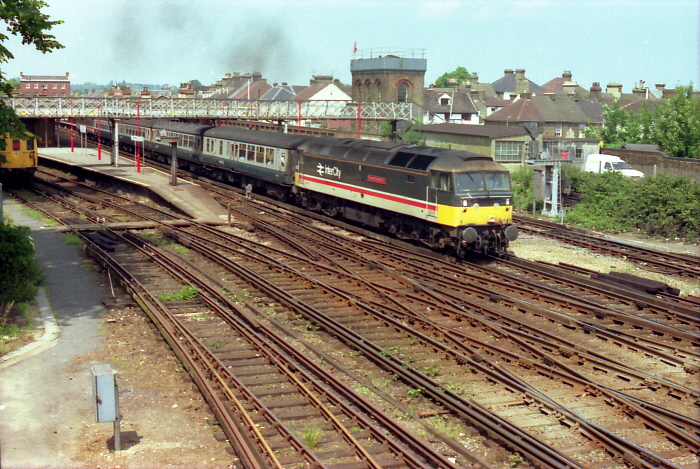 Class 47 No. 47618 ''Fair Rosamund'', wearing InterCity Executive livery, was seen departing Faversham,