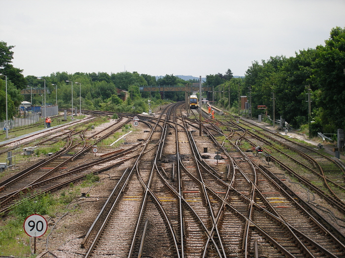 An eastward view shows the divergence of routes: branching off to the right, beyond the sidings, is the line to