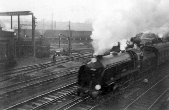 The steam shed in action: ''Schools'' 4-4-0 No. 30939 ''St Olaves'' hurries past the depot with a Victoria to Ramsgate via Herne Bay train, as an ''N'' Class Mogul can be seen on one of the shed approach roads. In the background can also be seen carriages in the berthing sidings. The Late Brian Relf © Colin Relf