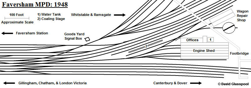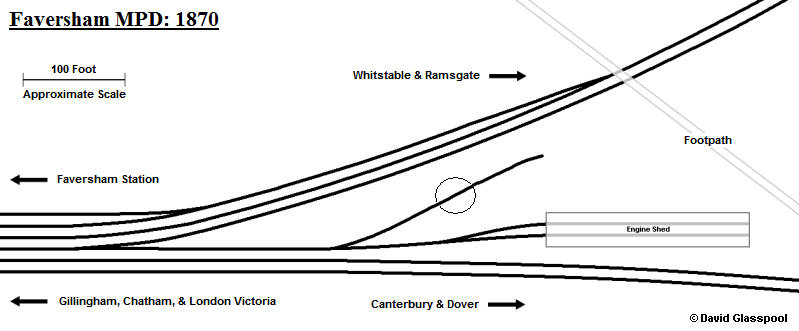 The very fact that Faversham was initially a terminus ensured that locomotive facilities were provided here from the outset. The first engine shed was a small, two-track dead-end affair, positioned beside the ''up'' line, just beyond the level crossing to the immediate west of the original station. This came into use with the latter in 1858. Services between here and Chatham commenced on 25th January of that year, and through running between Victoria and Canterbury was possible from 3rd December 1860. Faversham became a junction on 1st August 1860, with the opening of the Whitstable extension, and to coincide with this, the decision was taken to erect an enlarged locomotive depot. This was to be located within the triangle created by the diverging lines, and consist of a brick-built dead-end structure accommodating two westward-facing tracks. When commissioned, the building measured 34-foot by 202-foot, featured a vented pitched-roof, and to its west existed a turntable. Whilst this later building became the main engine shed at the site, the earlier-opened structure continued to be used in conjunction with it.