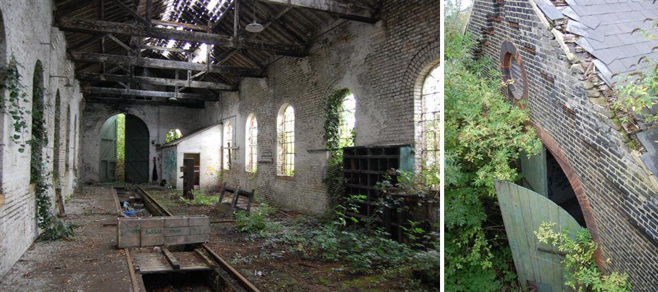 On the left, a second interior view this time shows the redundant wagon repair shop, which retains not only an inspection pit, but also rails and timber doors. Wooden trussing continues to support the slate-tiled roof, which is showing obvious signs of decay. The photograph on the right, however, shows the good quality of the slate tiles, which suggests that they are in fact quite recent. Both © Nick Skinner