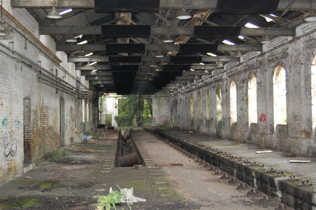This internal view of the redundant engine shed, looking east, shows the still extant locomotive inspection pits, and the chairs of the removed rails. The crème brickwork of LC&DR origin can be seen emerging through the whitewash wall finish. © Nick Skinner
