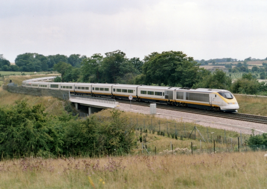A continent-bound Eurostar is seen coming off the junction (which is hidden by the trees in the background). Behind the formation is the former track bed of the Gravesend West branch. A new track bed was laid parallel with it in order to slew the curve from Fawkham Junction, to avoid a turn which was too tight. © David Glasspool