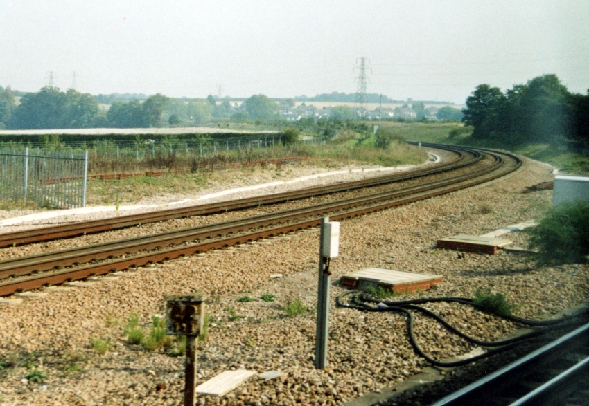 A north easterly view from Hook Green Road shows that the track was down and ballasted, but the catenary masts had yet to receive wires. Fawkham Junction is a mile behind the camera. © Mike Glasspool