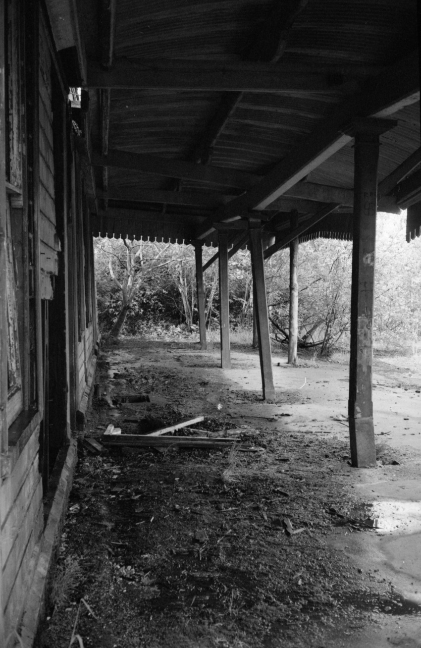 Over twenty-five years since closure to passengers, the main station building — showing obvious signs of neglect — was still very much in existence. Although partially collapsed, the sections of canopy valance in view were still in remarkably good condition. In the shadows can be seen a sash-style window frame — typical of the era — and a sizeable chunk had been taken out of the building’s timber sides. © David Glasspool Collection