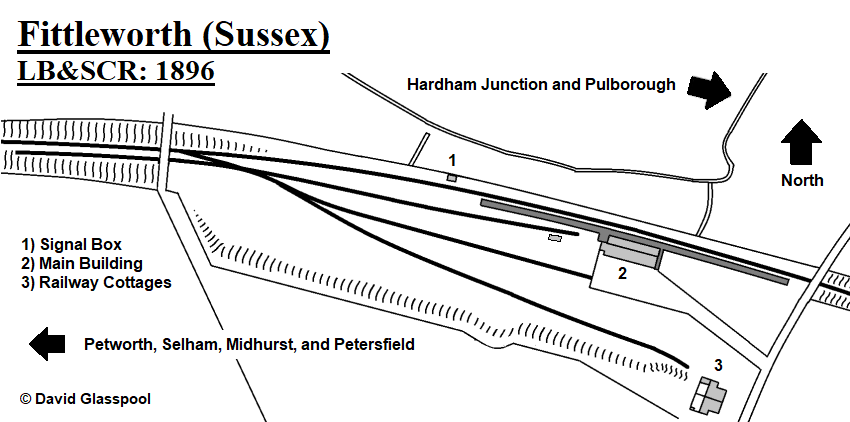 The line from Horsham to Petworth opened to traffic on 10th October 1859, but no station was in evidence at Fittleworth from the outset. The intermediate stops at the time were at Billingshurst and Pulborough, and from the outset the route was single-track in its entirety. The line was worked by the LB&SCR from the outset, and the independent “Mid Sussex” company was subsequently purchased by the former on 31st May 1860. A single-track extension from Petworth to Midhurst was brought into use on 15th October 1866; the 5½-mile line was promoted and built by the “Mid Sussex & Midhurst Junction Railway”, worked by the LB&SCR from the outset, and subsequently absorbed by the latter in June 1874. In the meantime, a line from what became "Hardham Junction" (about 1400-yards south of Pulborough) to Ford Junction (about ⅔-mile east of Ford) via Arundel had opened to traffic on 3rd August 1863.