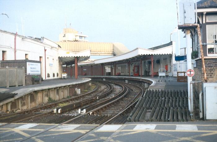 A landward view from the ''down'' platform shows the tight curvature of the platforms to good effect. At this time, Folkestone still retained a ferry service to Boulogne. Both tracks here have guide rails, and at the time of this photograph, the enclosed footbridge was operational. The V-shaped canopy of the ''up'' platform, dating from 1893, can be seen in the background. Notice that the canopy design on the left is of a different ilk. After the closure of the rolling stock berthing sidings to the west of the station, the ''up'' platform was greatly extended seaward. The brown brick retaining wall on the left is on the former site of the single-track connection from the berthing sidings. The SER canopy and white-washed platform offices mark the extent of the 1893 station. © David Glasspool Collection
