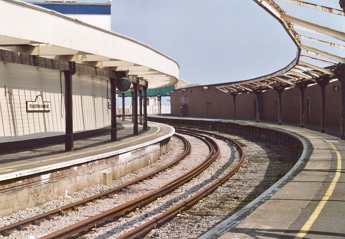 A seaward view shows the severe reverse curves of the platforms and, in the background, a glimpse of the SR enclosed concrete footbridge, erected during 1938. The canopy on the left is of 1938 origin, dating from the improvement works, whilst that o the right is a British Rail product, completed after the closure of the rolling stock berthing sidings and the extension of the ''up'' platform. © David Glasspool