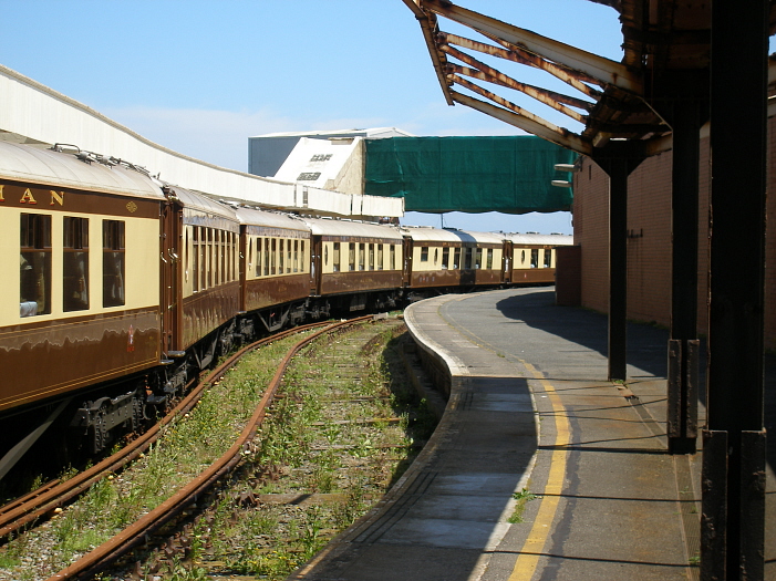 The luxury Pullman vehicles make quite a contrast to the rusting BR canopy framework of the disused ''up'' platform. A sudden change in the rail level is observed: the furthest two Pullman cars from the camera have tilted to the right. From the level crossing southwards, the harbour station extends some two fifths of a mile, of which the last ¼ mile is wholly surrounded by the sea. The footbridge covered in tarpaulin in the background is that erected by the SR during 1938. © David Glasspool