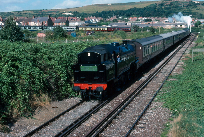 On 12th September 1991, Standard Tank No. 80080 was seen at the rear of the ''Network Harbour Master'' shuttle special. The formation is depicted trundling down the Folkestone Harbour branch: the rolling stock in the background, which includes an EPB unit and a pair of spare BR Mk 1 carriages for the shuttle, mark the position of the main line. © David Glasspool Collection