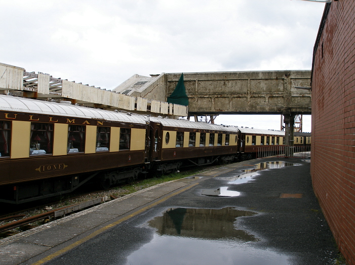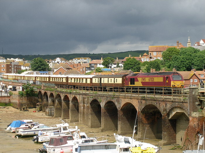The official closing ceremony took place on 12th April 2008, but in spite of this, the VSOE service continued to operate down the branch, and was scheduled to do so all that Summer, every Thursday and Sunday. At the time, objections against the closure of the line from a number of operating bodies, including train operating company South Eastern and freight haulier EWS, gave Folkestone Harbour station some hope. Alas, it was not to be. In the above view, Class 67 No. 67021 was observed bringing the sparkling Pullman stock down the branch from the sidings at Folkestone East, in preparation for the return leg to Victoria. Classmate No. 67026 was on the rear of the train. Note the large brick appendix in the background, jutting out from the viaduct's left-hand side. This was formerly host to a signal box. © David Glasspool