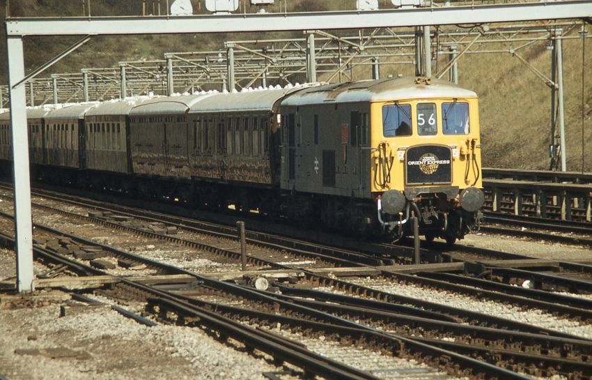 Electro-Diesel No. 73121 is seen in the Folkestone Harbour branch exchange sidings with the VSOE "British Pullman". The headcode is that of Folkestone Harbour to Victoria via Oprington and Herne Hill. The gantries on the right stand over the rolling stock sidings which were laid in 1960 as part of the Kent Coast Electrification Scheme. © David Glasspool Collection