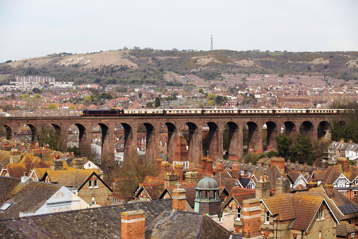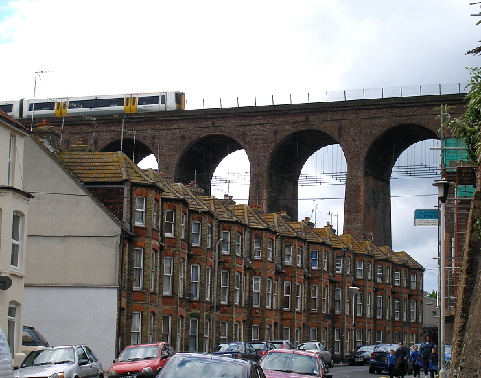 Each viaduct arch is now host to six steel tie rods, and part of the track bed is now equipped with a fence, but these additions do not make the structure any less impressive. A Dover-bound Class 375 flies over the viaduct in a view in which all the structures in evidence are Victorian. © David Glasspool