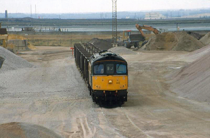 Dutch-liveried Class 33 No. 33002 is seen at the eastern-most extremity of the line across the Hoo Peninsula, within the aggregate terminal, awaiting its train of wagons to be loaded. The red buffer stops can just be seen emerging from behind the rear of the formation, the track thereafter to the former Port Victoria station site having since been lifted. The derelict wooden struts of Port Victoria pier are still in existence: they are positioned out of view in the above picture, to the left of the jetty seen in the background, and emerge at low tide. As for No. 33002, the locomotive managed to last in private EWS ownership for a year, being withdrawn in February 1997. The locomotive finally found a permanent home in preservation at the South Devon Railway, arriving there in January 2005. © David Glasspool Collection