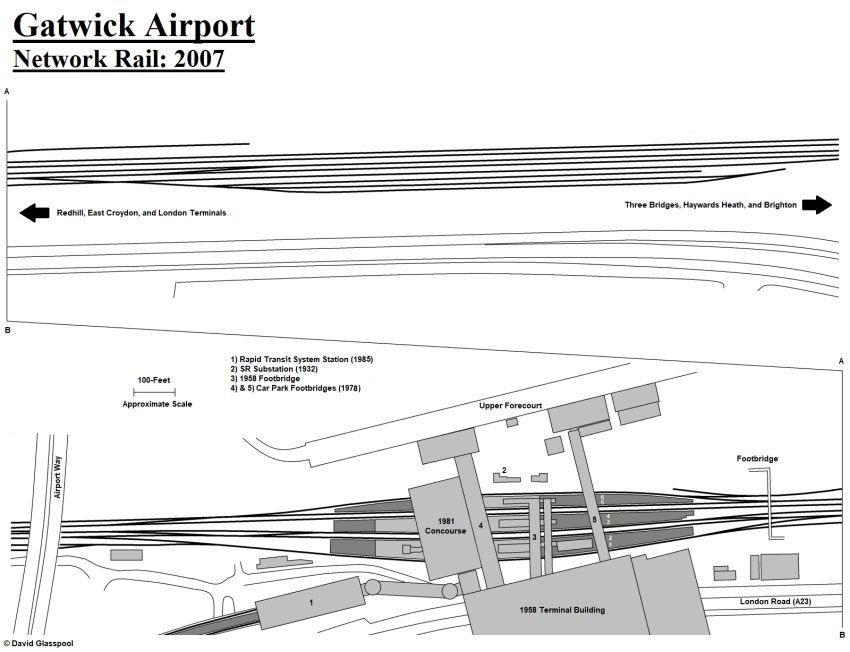 The station had started to look rather tired by the time of this northward view from platform 2, as rust had taken hold of one of the car park footbridges built in the late 1970s. Although crossing the station, the bridges linking the terminal with the car parks have no access to the platforms. The Southern Railway's concrete substation, commissioned as part of the Brighton Line electrification, can just be seen in the background, right of centre. On the far left is the 1958 terminal building, whilst at platform 1 is one of the Class 460 units introduced in 2000 for the Gatwick Express. © David Glasspool