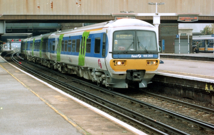 The Class 119 DMUs were long gone and the Reading to Gatwick Airport services were now operated by the 1993-introduced Class 166 "Turbo Express" DMUs. No. 166203, seen here at platform 3 wearing the colours of then franchise operator "Thames Trains", will shortly depart for the "up" sidings south of the platforms, to stable prior to forming a return working. © David Glasspool