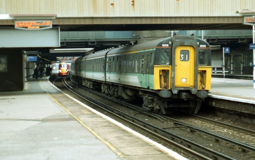 4-CIG No. 1856 is seen departing platform 3 southbound; the head code suggests that this is a terminating service from London Bridge. However, after departure, No. 1856 did not enter the sidings south of the station, based on one of your author's other photographs. The departure indicator board upon the platform suggests this is actually the 13:24 service to Horsham, departing three minutes late. In the background, amongst a sea of bridges, can be seen a Class 460 Gatwick Express unit arriving from London at platform 2. © David Glasspool