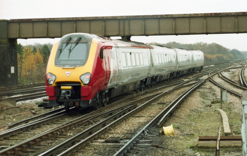 A four-car Class 221 "Voyager" is seen departing southwards from Gatwick Airport, forming a cross-country service from Manchester Piccadilly to Brighton. Until 2002, this working was formed of BR MK 2 air-conditioned stock hauled by a Class 47 diesel. © David Glasspool