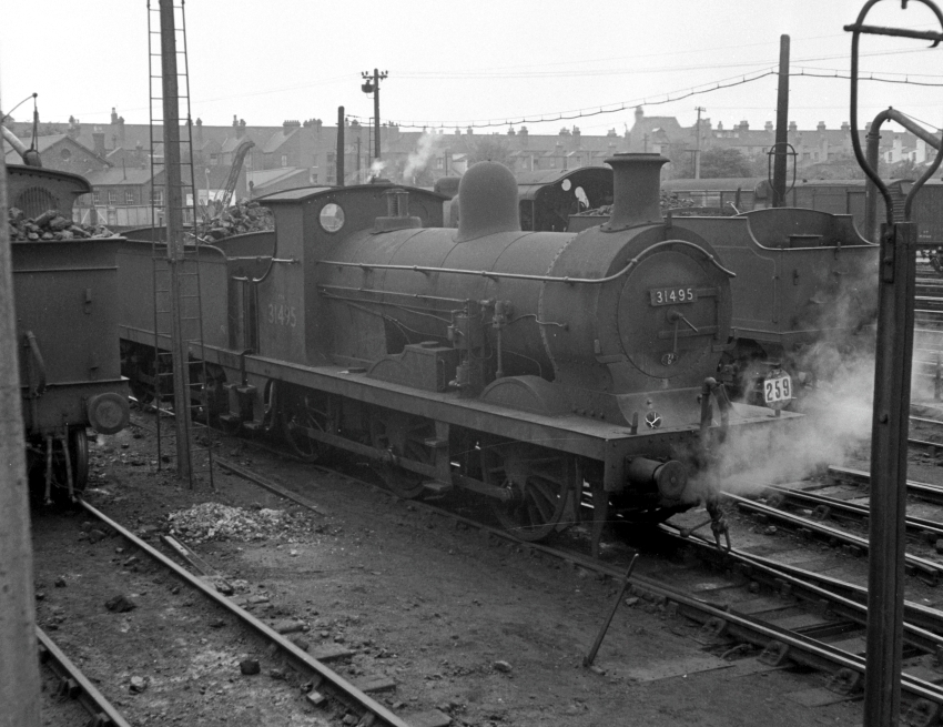 "C" Class 0-6-0 No. 31495 is seen upon the complicated series of tracks in-between the engine shed and turntable, as depicted in the diagram above. "Ian Allan ABC Locoshed" books, applicable to June 1955 and May 1959, both have this locomotive as being allocated to Gillingham. On the left is an 0-4-4 "H" Class Tank Engine, behind either an "N" or "U" Class 2-6-0, whilst in the background, to the left, can be seen the station's goods shed. © David Glasspool Collection