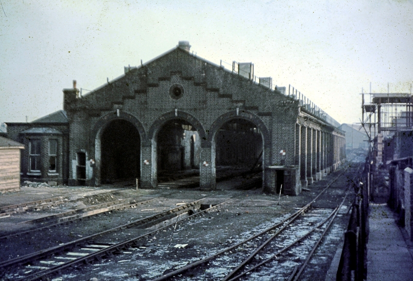 The western façade and all is now quiet. The steam era is over and the site was soon to be cleared. Indeed, at this late stage, the former engine shed was still standing in complete and remarkably good condition, with rails in place. The tank had been removed from the water tower by this time. Note the house-like bay window on the left-hand side of the building, forming part of the single-storey offices along the structure's northern elevation; this was a design feature shared with the shed at Faversham. The pitched roof in the distance was that of the electric car shed, which dated from the 1939 electrification scheme. © Terry Tracey