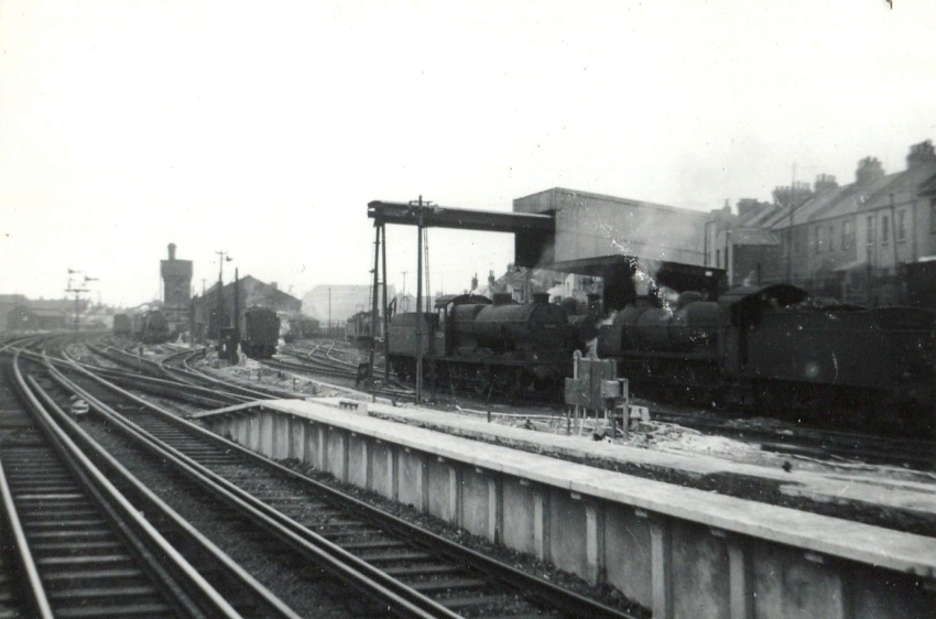 An eastward view from the station's "down" platform shows plenty of steam activity. The engine shed can just be seen in the background, alongside which is the prominent water tower. The contraption straddling the engines just right of centre is a coal gantry, installed by British Railways about three years prior to this photograph. "Q" and "N" Class locomotives are in evidence, and the prefabricated concrete extension of the island platform has yet to be in-filled. © Roger Goodrum Collection