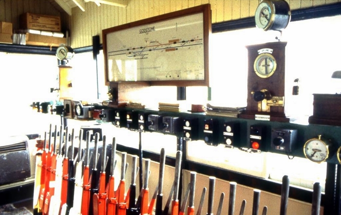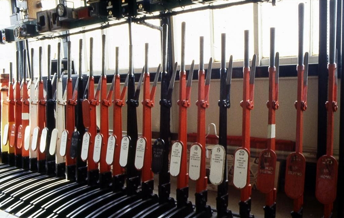Red levers controlled ''stop'' signals, black levers controlled points, and white levers were designated ''spare''. Out of view on the right was a yellow lever, which controlled a ''distant'' signal. © Peter Gibbons