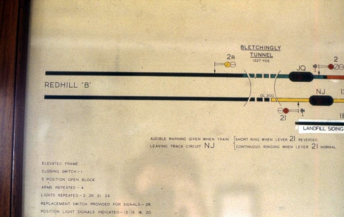 The functions of Redhill ''B'' Box were taken over by Three Bridges Signalling Centre on 12th May 1985. The oval-shaped black blobs on the diagram indicate track circuits. © Peter Gibbons
