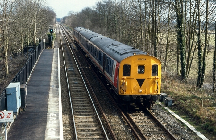 The start of the electric timetable is imminent as Hampshire/Berkshire DEMU No. 205033 approaches the partially staggered platforms with a Tonbridge to Reading service. The recently-laid conductor rails were covered in rust. © David Glasspool Collection