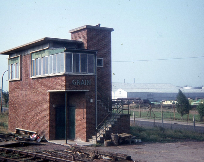 Grain signal box, which controlled the throat of the station built primarily for use by oil refinery workers, is seen not long before demolition. This was built to a standard BR design, a similar example later coming into use at Appledore in 1954. © Roger Goodrum