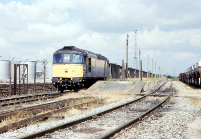 The long-disused island platform is in evidence in this westward view, which depicts Class 33 No. 33002 "Sea King" with hopper wagons bound for Foster Yeoman's aggregate terminal. © David Glasspool Collection