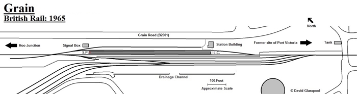 This station had a somewhat brief working life, enjoying a passenger railway service for just ten years before closure. A small, single-storey brown brick structure, formerly the main station building, still exists as the last remnant of this short-lived site. However, whilst today there still remains an interesting collection of sidings on the Isle of Grain, primarily to serve Thamesport and an aggregate depot once operated by "Foster Yeoman", to the untrained eye it is difficult to picture a railway station having ever been here.