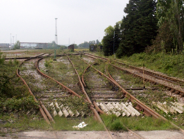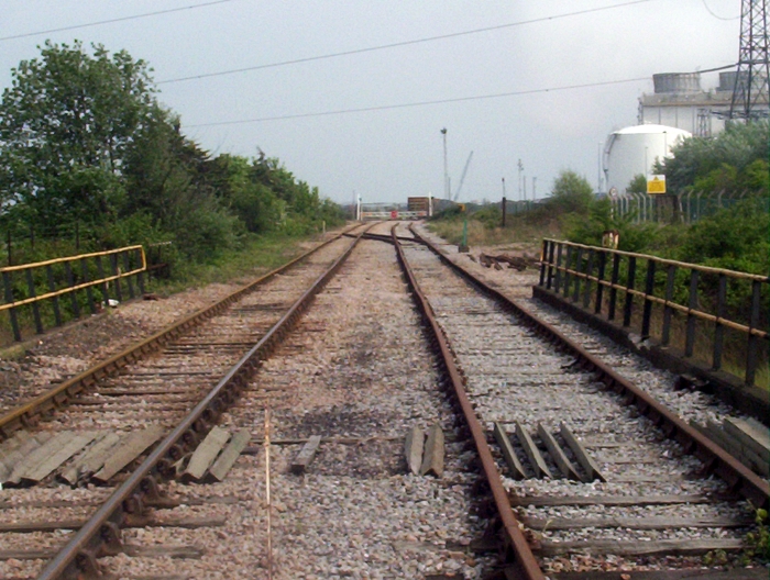 View north from "B" Gate Level Crossing. If you look along the right hand track it can be seen to pass through a gap in the fence: this is the boundary between BP track and DB Shenker (formerly EWS) track. Just beyond the fence the line splits into two where it used to run either side of the Grain Station island platform. The two tracks to the left of the fence are the last remains of the BP Refinery Exchange Sidings which once occupied the adjacent flat area. Caption: David Morgan; Photograph © David Glasspool