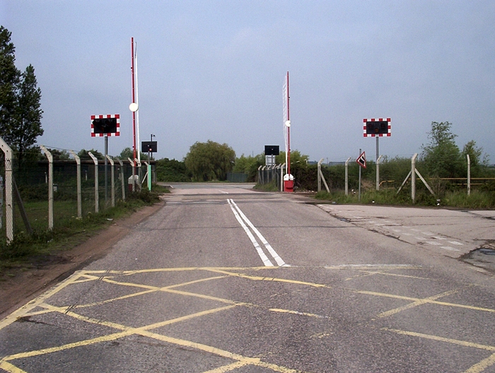 This is ''B'' Gate Level Crossing which now gives road access to Thamesport. However, as the name suggests, it once formed one of several gates giving access to the BP Refinery. Caption: David Morgan; Photograph © David Glasspool
