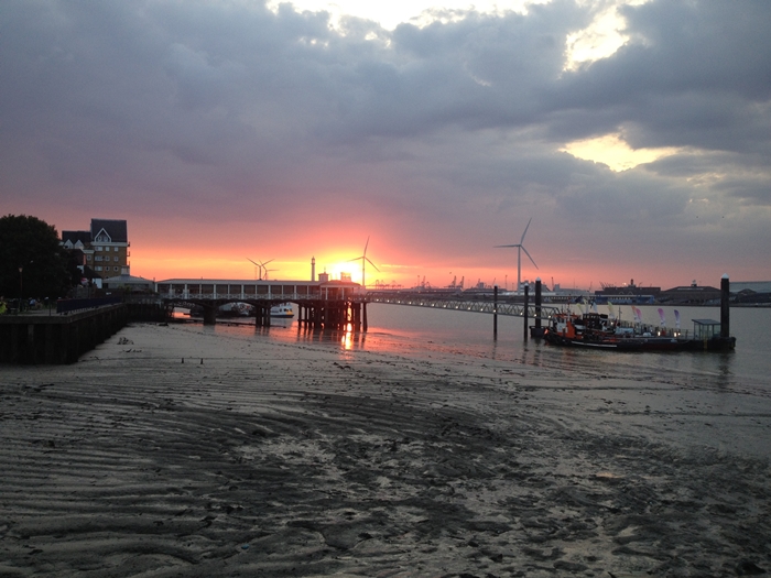 The Tilbury Ferry now uses a pontoon which is linked to the Town Pier by a 45 metre (148-feet) lattice walkway. The pontoon formally opened on 19th October 2012 and replaced the Tilbury Ferry's previous docking point which resided 160-yards to the west. The wind turbines on the horizon were completed in 2013. © David Glasspool