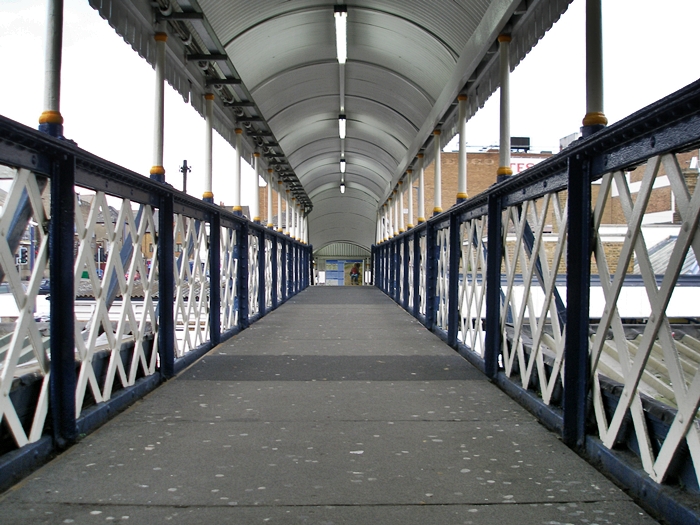 A northward view within the SER lattice footbridge, looking towards the Thames. Sadly, this did not qualify as part of the station's overall Grade II Listed status. As a result, it was removed from the site on completion of a new footbridge to the west, on 1st December 2013. © David Glasspool