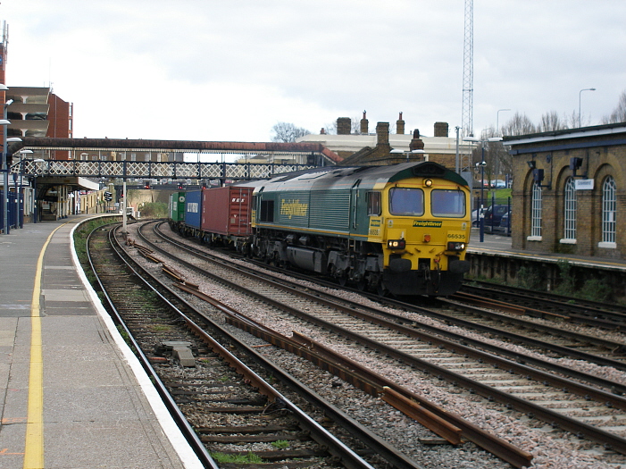 Container workings over the North Kent Line have been a regular feature of the route since the opening of Thamesport in 1990. Class 66 No. 66535 is seen heading westward on such a service, using the ''up'' through track used by the Class 56 on the previous pages. © David Glasspool