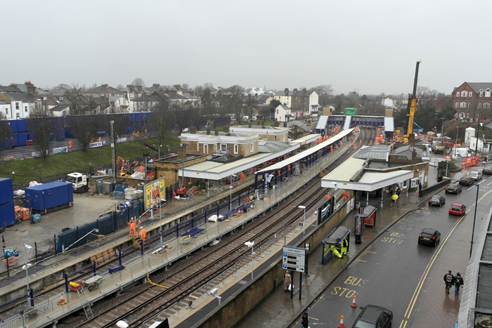 On the last weekend before the station reopened, the island platform was nearing completion: the canopy was up and most of the metal railings lining the surface's southern edge had been fitted. The third footbridge staircase and lift shaft had also been assembled and work was progressing on the surrounding brickwork. Click the above for a larger version. © David Glasspool