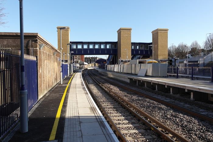 The footbridge still had some of its ''bubble wrap'' on and the ''down'' side building's canopy was missing a section of its timber valance. On the right, behind the railings, can be seen a service stabled in the newly-created bay line. © David Glasspool