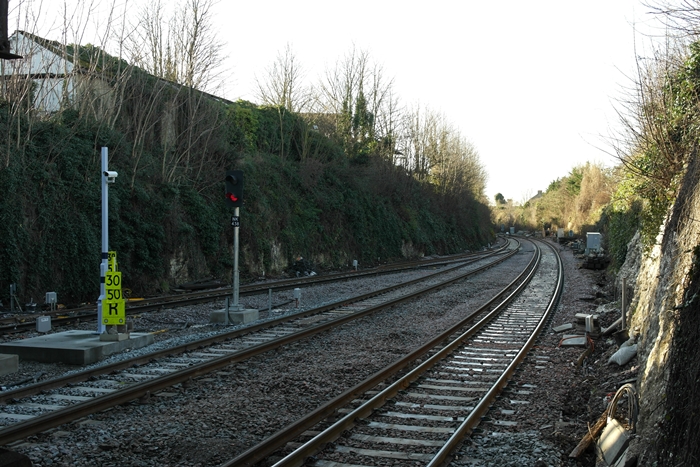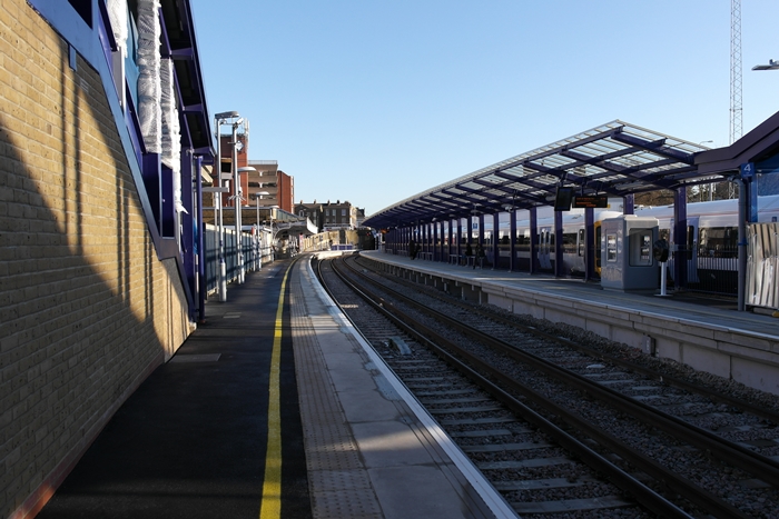 A London-bound view shows the bay and ''up'' lines converging on the left, a colour aspect light and the obligatory CCTV pole being situated within the fork of the tracks. The signal post seen here is for the ''up'' line, that for the bay being out of view to the left. In the distance exists a facing crossover. © David Glasspool