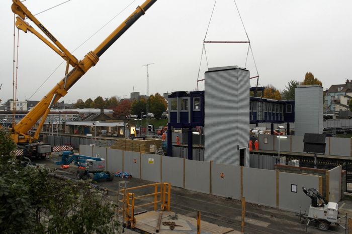 The new footbridge is a rather unlovely design; there was some evidence of more conforming crème brickwork, however, taking shape just to the left of the structure. © David Glasspool