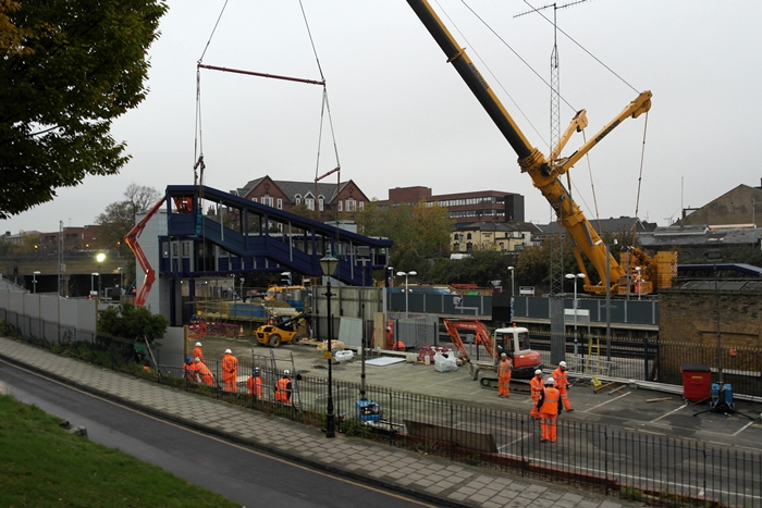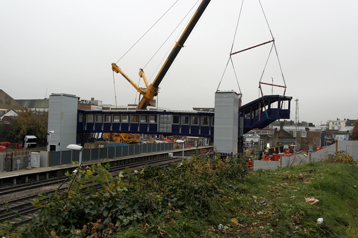 In this eastward view we can see a blanking plate on the footbridge's main walkway, which indicates the position of the lift shaft that will connect it with the island platform. © David Glasspool